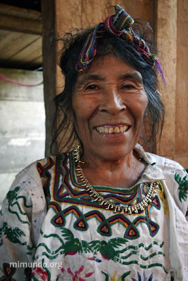 An Ixil woman from the Chajul region proudly displays her huipil (bordered blouse) that she managed to keep over the years despite years of hiding in the jungle and several attacks from the army.