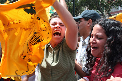 A member of H.I.J.O.S. waves a flag depicting the image of one of the many victims killed by Guatemalan security forces during the civil war. In many cases, the person represented on the flag is the flag-waver’s own father or mother.Today is not for celebrating