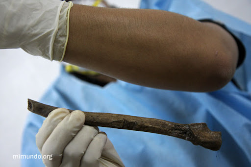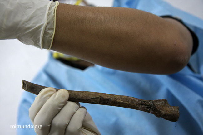 In this image, an ulna from a forearm shows two sharp traumas. According to the forensic anthropologists, this type of lesions are commonly found when a victim attempts to protect his or her face from an attack with a machete or a similarly sharp object.