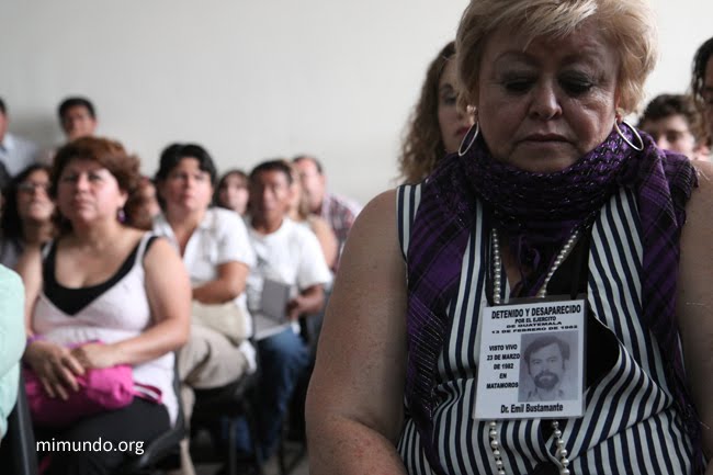 Dozens of wartime victims’ family members filled the courtroom to witness the historic court appearance of Lopez Fuentes, without a doubt the highest-ranking official detained on genocide charges. The always-present Marylena Bustamante attended the event along with a laminated photograph of her detained-disappeared brother Emil.
